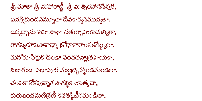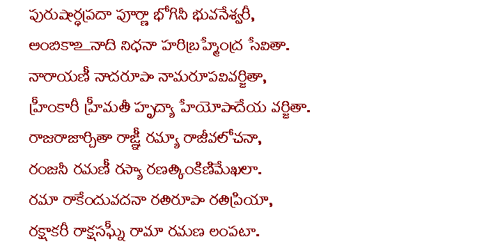Meaning : O Devi, good morning to you whose eyes are like the lotus and the bright face of the full moon; the consorts of Brahma , Sankara and Indra pay their respects to you the ocean of mercy dear to the Lord of the Vrishabadri.